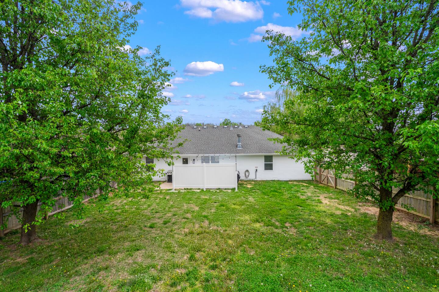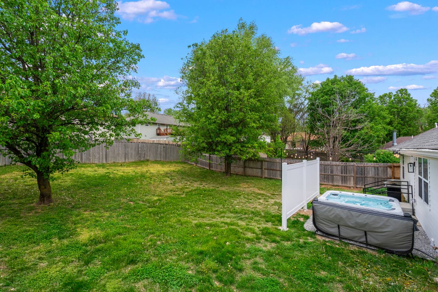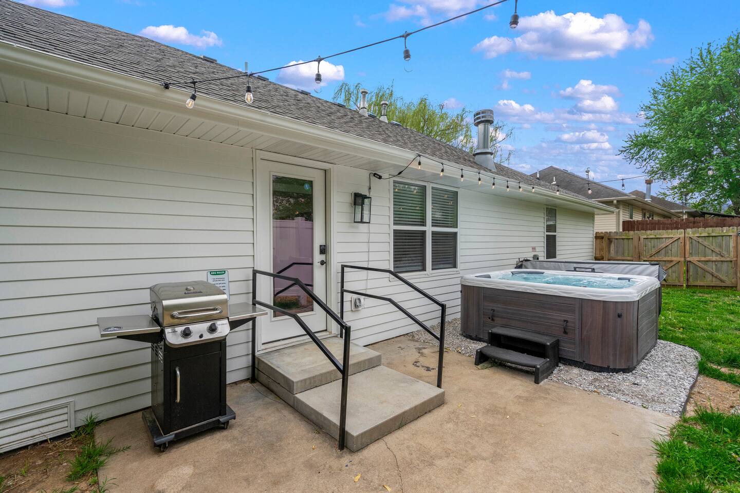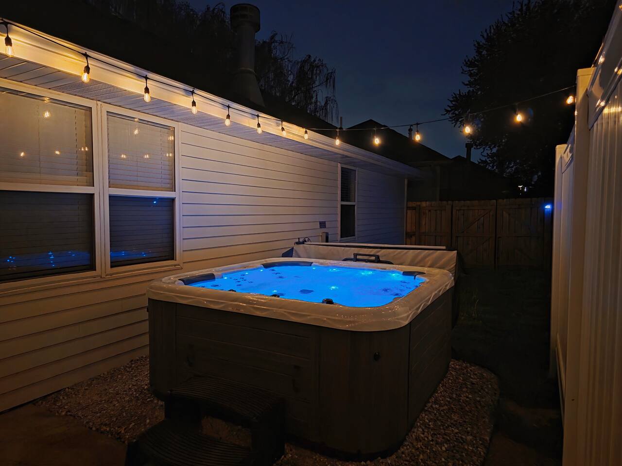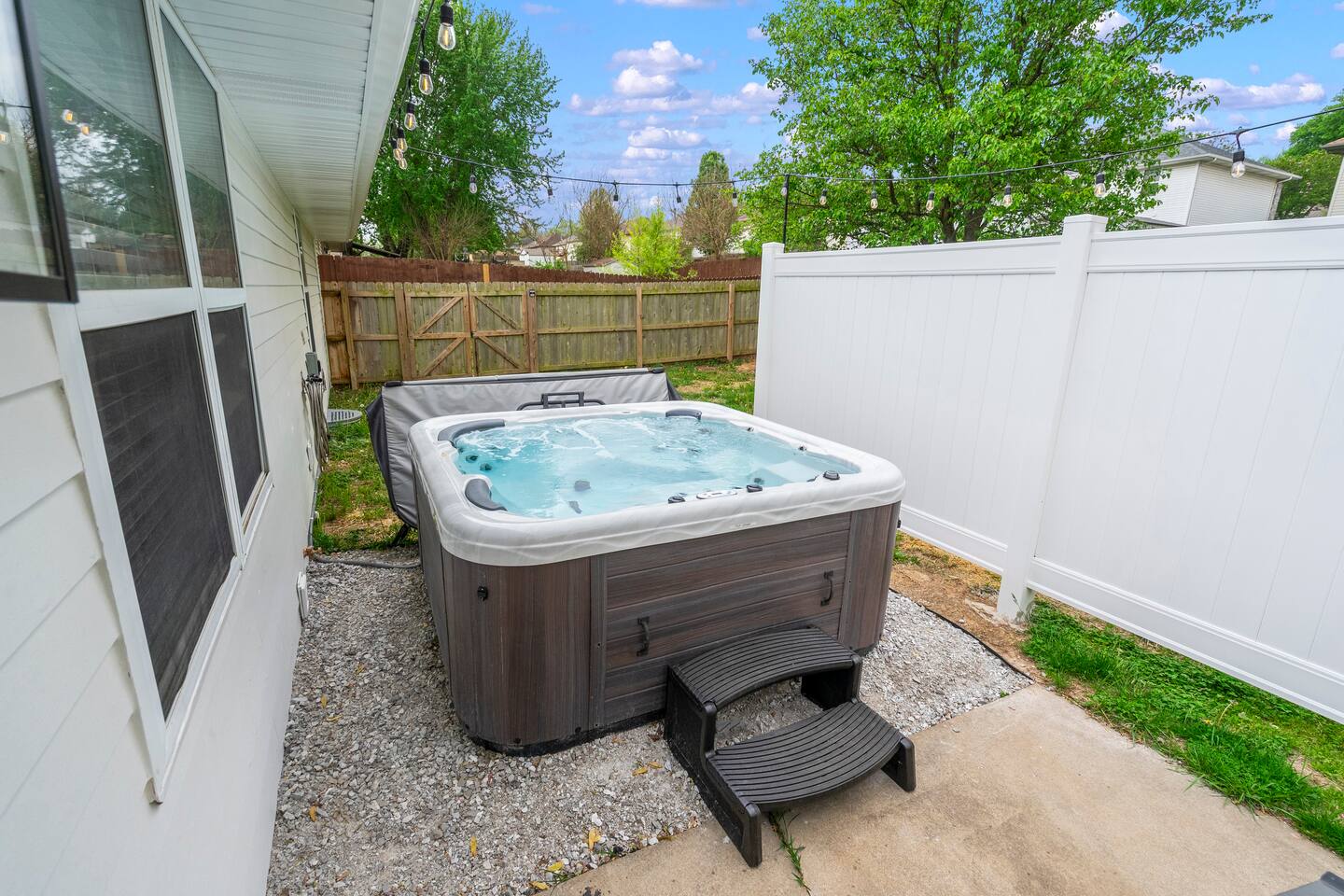 🏡 Living Room Relax in a bright, open living room with plenty of comfy seating, modern décor, and a cozy atmosphere perfect for movie nights or hanging out with friends and family. The space is designed for lounging, with a stylish mix of textures and a clean, inviting layout. 🍽️ Kitchen Enjoy cooking in a fully stocked kitchen with quartz countertops, stainless steel appliances, and all the essentials for a home-cooked meal. Whether you're prepping breakfast or hosting dinner, this kitchen blends function with high-end style. A dining table nearby offers a perfect spot for meals or game nights. 🛏️ Bedrooms This home features 3 bedrooms designed for comfort and flexibility: - Primary Suite with a king bed and smart TV for ultimate relaxation. (Sleeps 2) - Second Bedroom with a queen bed and cozy vibe. (Sleeps 2) - Third Bedroom is a kid-friendly zone with 4 twin beds and a toy table—great for families or groups. (Sleeps 4) All rooms features a TV with an adjustable mount for the perfect viewing angle, along with soft linens, and thoughtful touches to make you feel at home. 🌳 Backyard Step into a private, fenced-in backyard—perfect for unwinding, letting the kids play, or enjoying some fresh air. Soak in the hot tub under twinkling string lights (available year-round) and fire up the BBQ grill for a relaxed evening cookout. Whether you're kicking back after exploring Springfield or making memories with loved ones, this outdoor space has you covered. ✨ Amenities Our home is packed with everything you need for a comfortable and memorable stay. Enjoy high-speed Wi-Fi, central heating and air conditioning, and the convenience of an in-unit washer and dryer. For entertainment, you'll love the full game room featuring a pool table, foosball, and air hockey. We also offer self check-in, free parking, and a welcoming, family-friendly space designed with your comfort in mind.