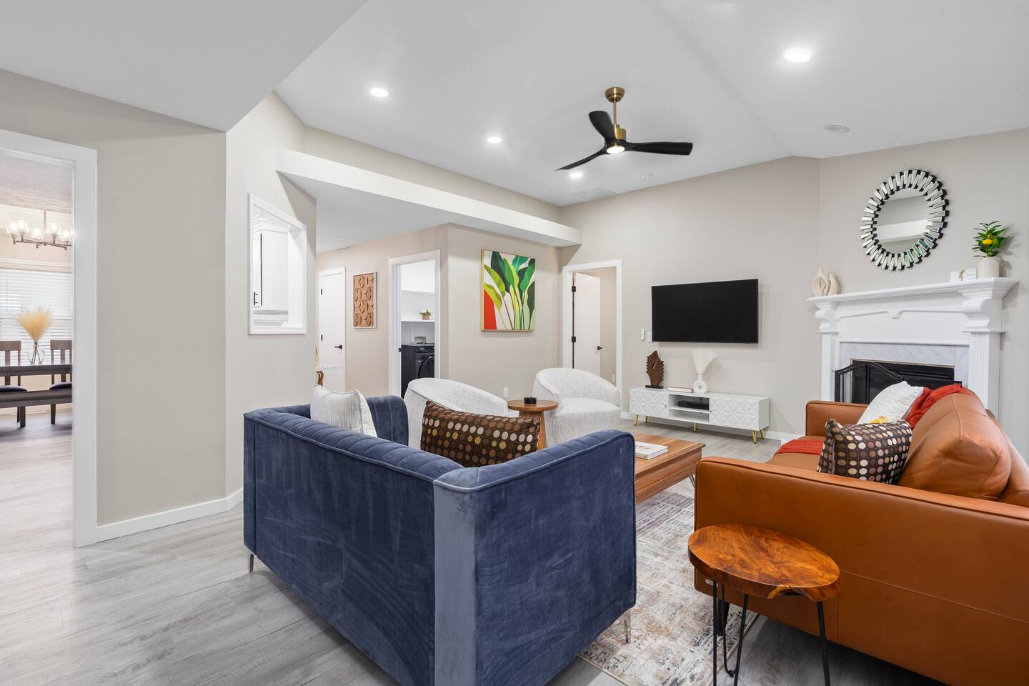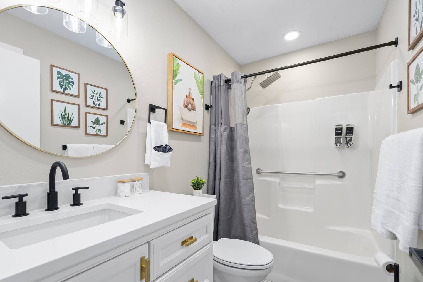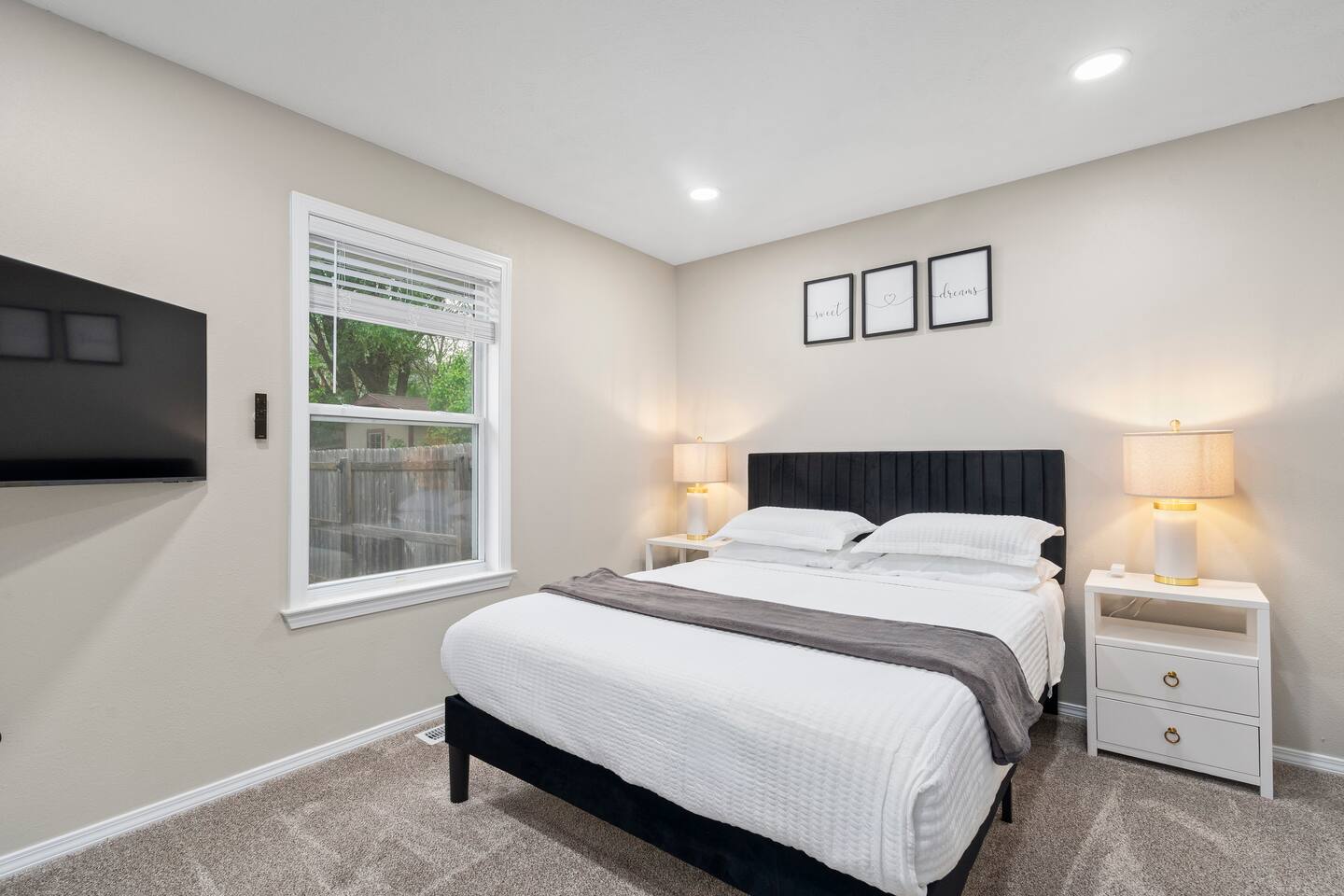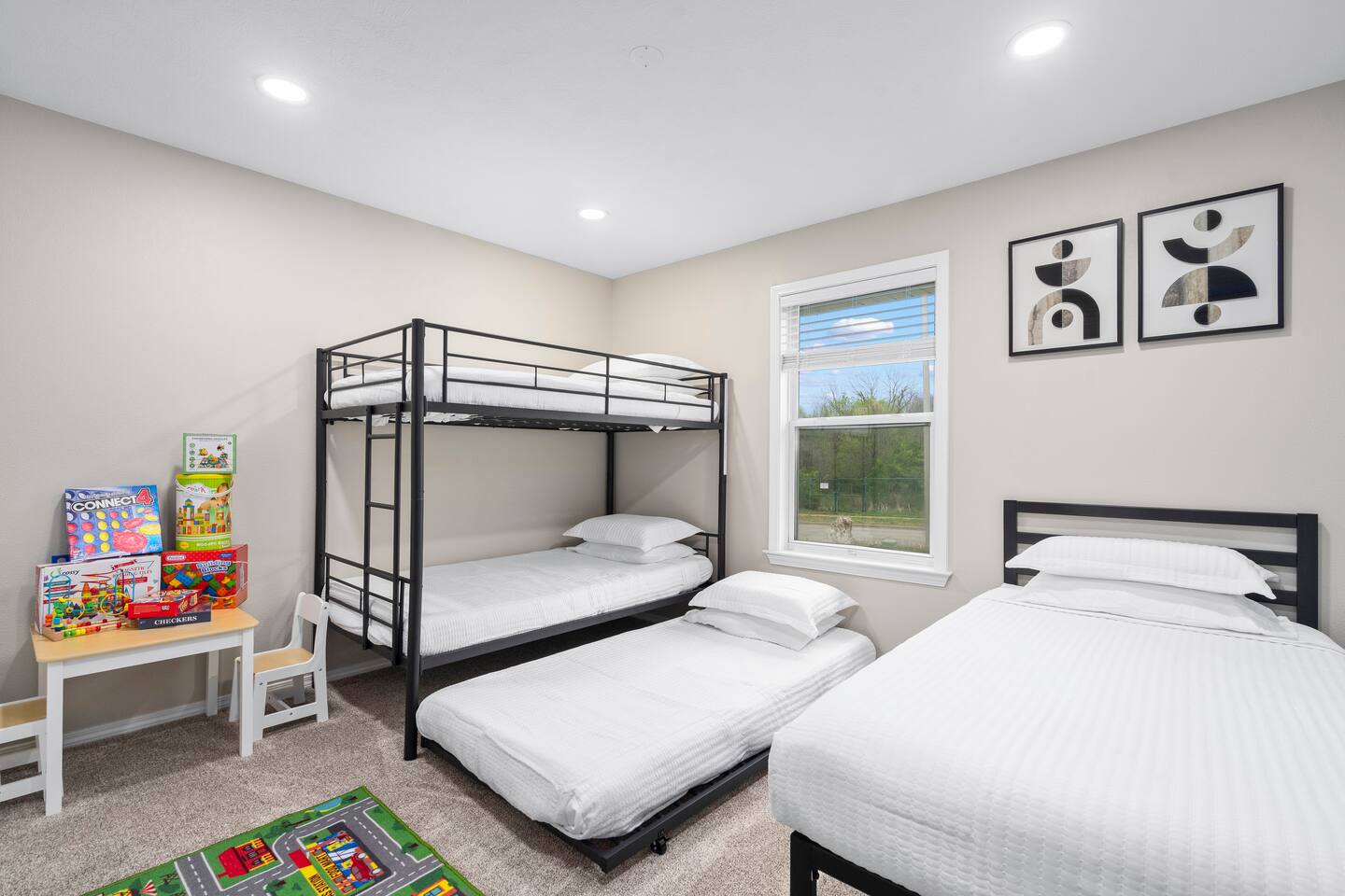 🏡 Living Room Relax in a bright, open living room with plenty of comfy seating, modern décor, and a cozy atmosphere perfect for movie nights or hanging out with friends and family. The space is designed for lounging, with a stylish mix of textures and a clean, inviting layout. 🍽️ Kitchen Enjoy cooking in a fully stocked kitchen with quartz countertops, stainless steel appliances, and all the essentials for a home-cooked meal. Whether you're prepping breakfast or hosting dinner, this kitchen blends function with high-end style. A dining table nearby offers a perfect spot for meals or game nights. 🛏️ Bedrooms This home features 3 bedrooms designed for comfort and flexibility: - Primary Suite with a king bed and smart TV for ultimate relaxation. (Sleeps 2) - Second Bedroom with a queen bed and cozy vibe. (Sleeps 2) - Third Bedroom is a kid-friendly zone with 4 twin beds and a toy table—great for families or groups. (Sleeps 4) All rooms features a TV with an adjustable mount for the perfect viewing angle, along with soft linens, and thoughtful touches to make you feel at home. 🌳 Backyard Step into a private, fenced-in backyard—perfect for unwinding, letting the kids play, or enjoying some fresh air. Soak in the hot tub under twinkling string lights (available year-round) and fire up the BBQ grill for a relaxed evening cookout. Whether you're kicking back after exploring Springfield or making memories with loved ones, this outdoor space has you covered. ✨ Amenities Our home is packed with everything you need for a comfortable and memorable stay. Enjoy high-speed Wi-Fi, central heating and air conditioning, and the convenience of an in-unit washer and dryer. For entertainment, you'll love the full game room featuring a pool table, foosball, and air hockey. We also offer self check-in, free parking, and a welcoming, family-friendly space designed with your comfort in mind.